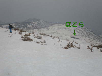 ![]() 天狗原の下の大斜面の上部には雪解け箇所があった。 There was a small ground exposed in the upper area of the large slope under Tenguppara becasue the snow has melted. |