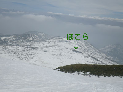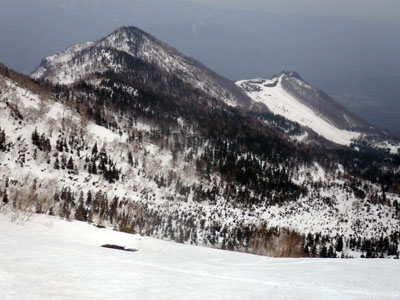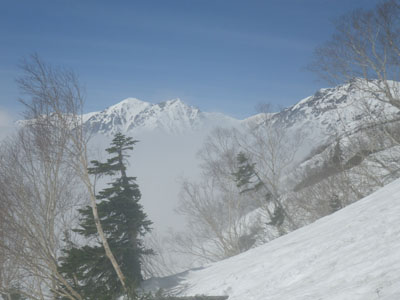 ![]() 天狗原の祠から見た白馬乗鞍岳の大斜面 普段はまだ見えないダケカンバが斜面株にたくさん出ている。 The large slope of Mt. Hakuba Norikura seen from the shrine in Tenguppara. The Dakekamba (Birch), which we do not see in this period, were seen in the lower areas of the slope. |