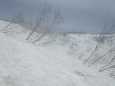 ![]() 天狗原の下の大斜面の下部には、ダケカンバがたくさん露出していた。 Many trees exposedc in the lower part of the large slope under Tenguppara. |