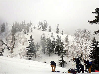![]() 霧の中の出発準備 Preparing for climb in fog. |