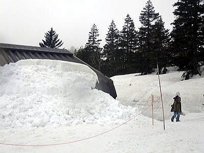 ![]() ロープウェイ駅舎。雪の多さがわかる。 The upper station of the ropeway with abundant snow |