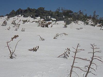 ![]() 天狗原の祠。雪が多いので、木は一部の上部が出ているだけ。 The shrine in Tenguppara. Because the snow was deep, only the top of some trees were above the snow. |