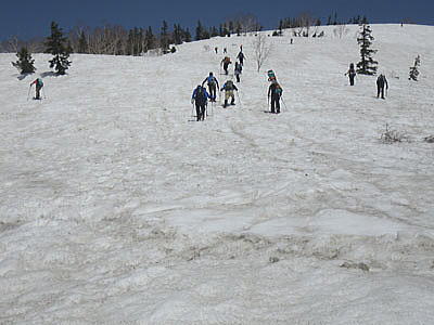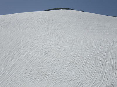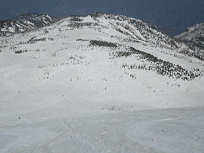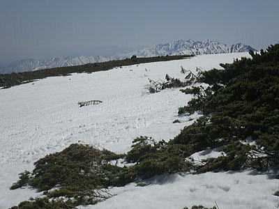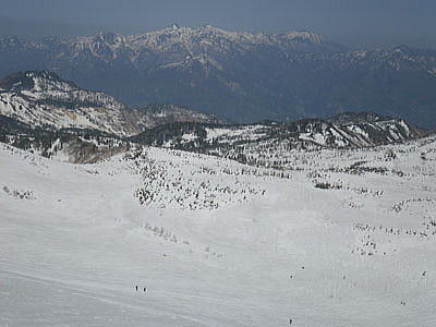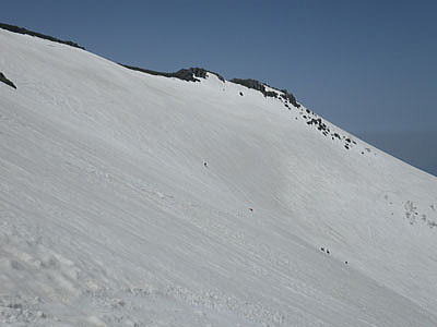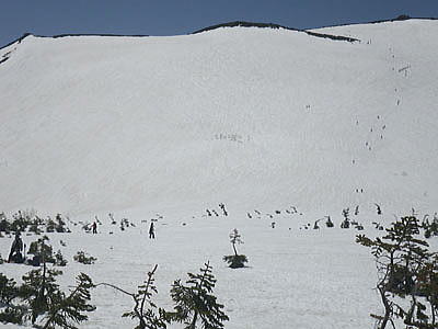 ![]() 白馬乗鞍岳の大斜面。天狗原の雪の少なさにかかわらず、 この大斜面下部には、1か所を除きダケカンバの露出も無かった。 The slope of Mt. Hakuba Norikura. Despite the smaller amount of snow around the shrine in Teguppara, the exposure of trees in this slope was still limited. |