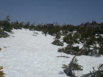 ![]() 白馬乗鞍岳頂上域直下から左手に蓮華温泉への下り口が見える。 The entrance to the ski course to Renge Hotsprings was seen from immediately below the summit area of Mt. Hakuba Norikura |