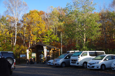 ![]() Entrance to the trail. Reporting form to the police is available here. Because the parking capacity here is limited, it may be reasonable to use the parking next to the camping ground of the Kyukaf-muara across the road. 火打山登山道入り口。登山届の用紙あり。 この入り口前の駐車場の収容力が小さく、トイレもないので、 道の反対側にある休暇村キャンプ場隣の大駐車場での 駐車を想定したほうがよい。 |