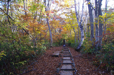 ![]() The trail to the Kuro-sawa stream is gentle and mostly paved with woods. 黒沢までの道は緩やかで、大半は木道になっている。 |