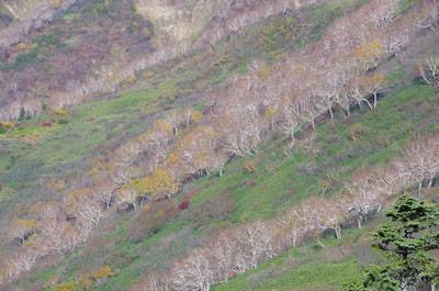 ![]() The dake-kamba trees seen in the center of the photo in the left. 左の写真の中央部にあるダケカンバの拡大写真。 |
