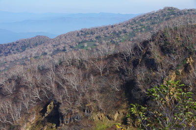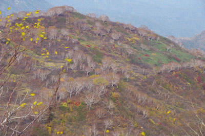 ![]() Dake-kamba trees etc. on the northeastern slope of theridge between Koya-ike and Kurosawa-ike. 高谷池を過ぎ、黒沢池への尾根から見た北東斜面の ダケカンバ他。 |