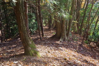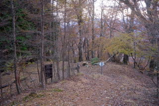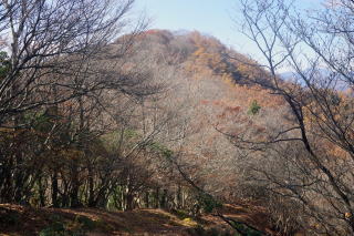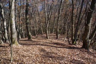 ![]() ゴンザス尾根に入るが、落ち葉のために道がわからない。 この尾根を下るにはGPSが必要。 GPS is necessary to go down this Gonzasu Ridge because the trail is fully covered with dead leaves. |