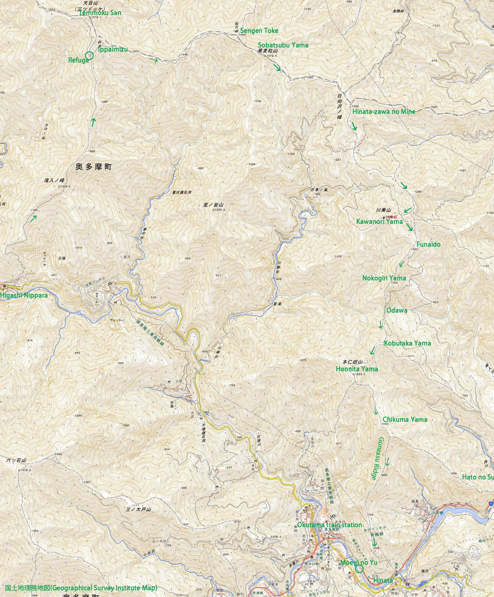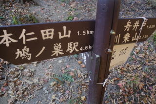 東日原Higashi Nippara 10:55―(220分[吉備人出版地図標準standard time 125 mins.])14:35―一杯水避難小屋Ippaimizu Hinangoya (refuge)7:00 (蕎麦粒山までto Sobatsubu Yama 75[75])―7:55仙元峠Sengen Tope (pass)8:05 ― 8:25蕎麦粒山Sobatsubu Yama 8:35―(50[45])―9:23日向沢の峰Hinatazawa no Mine ―(100[75])―11:05川苔山Kawanori Yama11:50―(20[25])― 12:10舟井戸Funaido ―(大ダワまで45[45])―鋸山Nokogiri Yama ―12:55大ダワOdawa―(35[35])―13:30瘤高山Kobutaka Yama―(25[20])―13:55本仁田山Honnita Yama 14:05―(鳩ノ巣駅分岐までto division to Hato no Su train station 45[40])― 14:07本仁田山すぐ南の奥多摩駅への分岐Division to Okutama train station―14:50筑摩山南の鳩ノ巣駅への分岐Division to Hatonosu train station―(100[60])―16:30本仁田山登山口(ゴンザス尾根登山口)――16:35もえぎの湯Moeg no Yu (hotsprings)