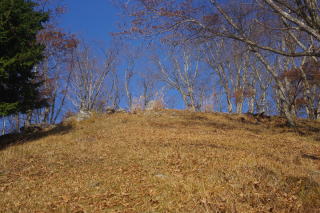 ![]() 日向沢の峰。西から歩いてくるとほとんど高さが無いが、 東からは急斜面をかなり登るので、「山」に見える。 Hinata-zawa no Mine. From the east, it looks a mountain. From the west, ii does not. It is the end of t he ridge coming from the west. |