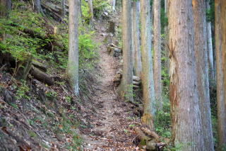 ![]() NHKのデジタル放送のアンテナを過ぎると道は尾根を外れ、 路面も平滑な土になるが、それでもなお かなりの勾配で、本仁田山から登山口までの 標高差900メートルを下りるのは大変。 After an NHK digital TV antenna, trail gets better with smooth soil surface zigzaging down. Still it was steep to walk down 900 meters from Honnita Yama to the trailhead. |