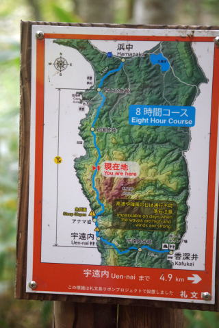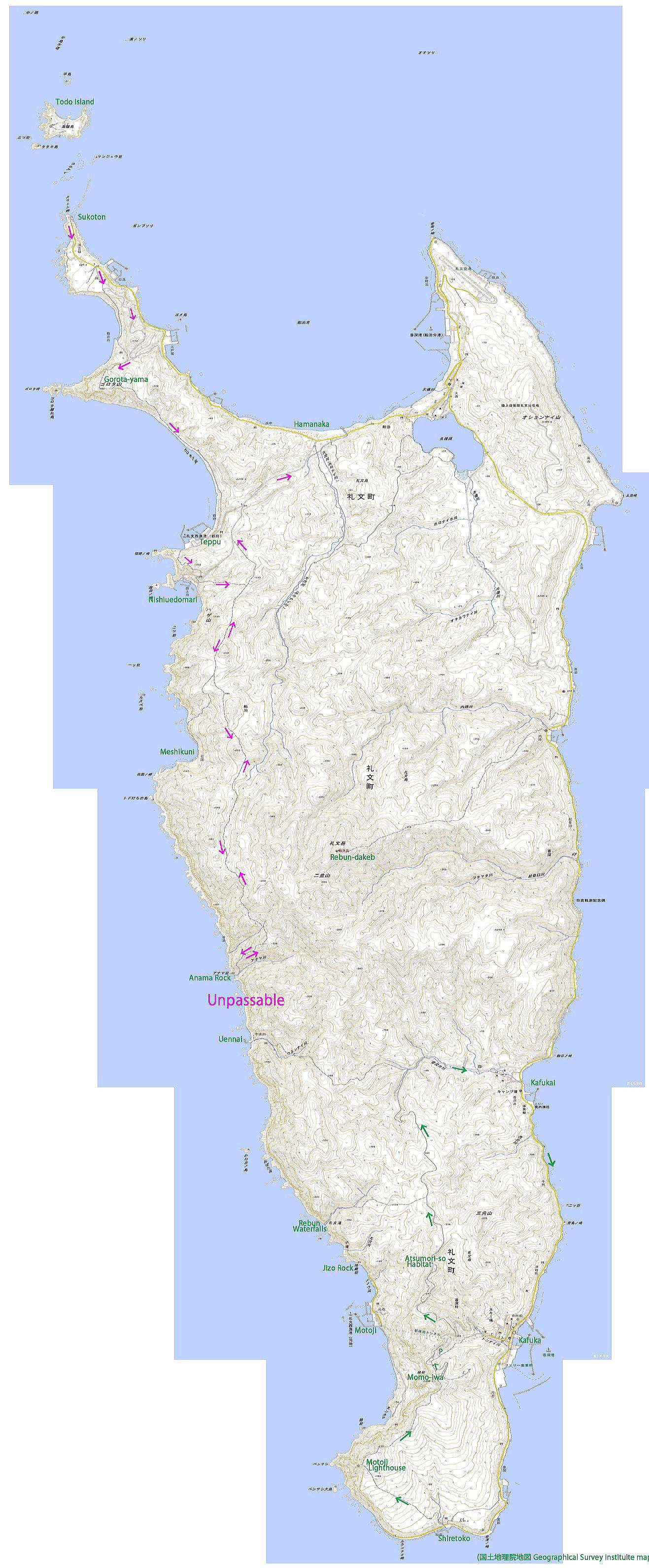 スコトン岬Sukoton Cape8:30―[ゴロタ山までTo Gorota-yama 70分mins.(昭文社「山と高原地図」標準standard 90分 minutes)]―トド島展望台Todo-shima viewpoint ――9:40ゴロタ山 Gorota-yama 9:50―[50分(標準90分)]―10:40鉄府 Teppu―[50分(標準60分)]―西上泊 Nishiuedomari 11:30―[20分(30分)]―11:50西上泊分岐点 Division to Nishiuedomari ―[25分(途中で昼食25分)(50分)]―召国分岐点 Division to Meshikuni 12:40―[120分(160分)]―14:40アナマ岩 Anama Rock 14:50―[105分(160分)]―16:35召国分岐点 Division to Meshikuni ―[15分(40分)]―16:50西上泊分岐点 Division to Nishiuedomari―[浜中まで55分(80分)]―17:05西上泊への車道分岐 Road division to Nishiuedomari―17:45浜中 Hamanaka ―[タクシー Taxi 35分mins. (If bus is available通常はバス49分)]―18:20香深Kafuka