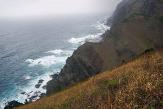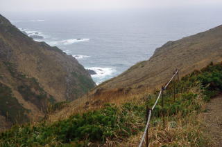 ![]() 間もなく、足元の悪い急斜面をアナマ岩脇の海岸に下る。 Soon we will descend to the coast next to the A nama Rock on an unstable and very steep slope. |