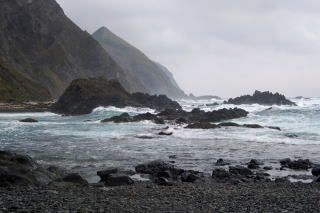 ![]() アナマ岩の脇の海岸。この先、道が無いので、 海岸の石や岩の上を歩くことになっている。 しかし、この波では無理。 Treckers must walk on the rocks and stones here because there was no trail after this. |