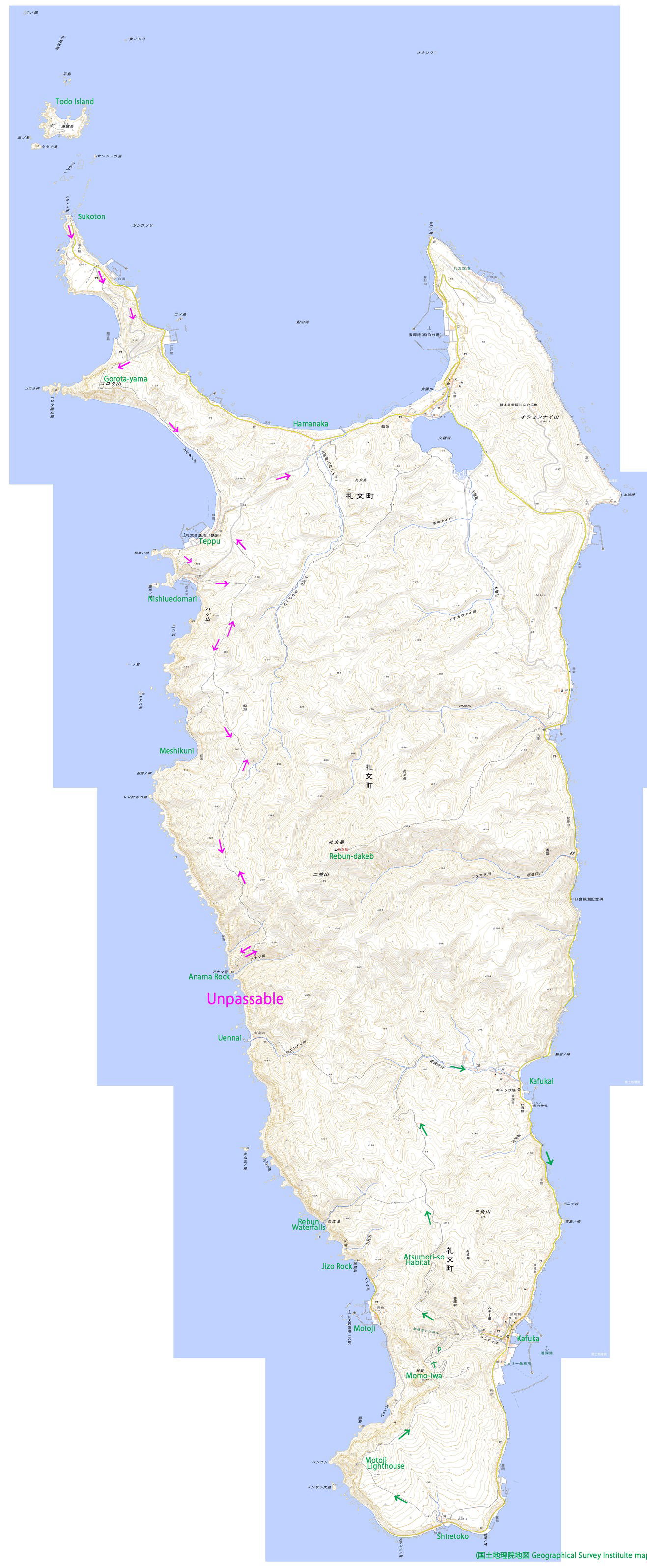 知床Shiretoko 9:15―[40分mins. (昭文社「山と高原地図」標準standard 50分 minutes)]―9:55元地灯台 Motoji Lighthouse 10:05―[45分(110分)]―10:50桃岩展望台 Momo-iwa Viewpoint ―[15分(20分)]―11:05桃岩展望台下駐車場 Parking for Momo-iwa Viewpoint ―[5分(15分)]―11:10礼文林道入り口 Entrance to Rebun Forestry Track ―[40分(50分)]―11:50アツモリソウ群生地 Atsumori-so Habitat 12:15―[15分(30分)]―12:30礼文滝分岐点 Division to Rebun Waterfalls ―[45分(50分)]―13:15ウエンナイ分岐点 Division to Uennai ―[20分(30分)]―13:35香深井 Kasukai―[60分(通常はバス8分) 60 minutes’ walk – usually a eight minutes’ bus ride]―14:35香深Kafuka (「うすゆきの湯」温泉Usuyuki-no-yu Hotsprings)