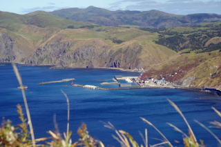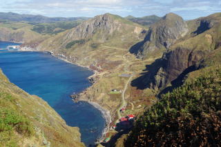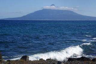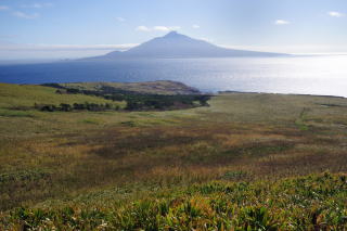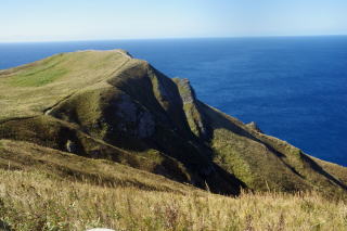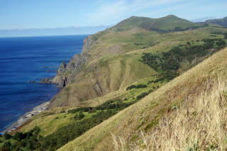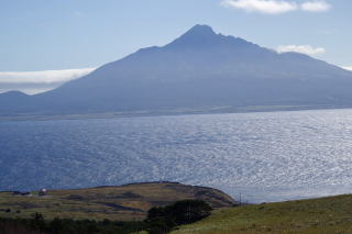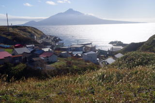 ![]() 知床の集落と利尻島。前日は視界不良のために 見えなかった利尻島がよく見えた。但し、逆光。 The village of Shiretoko and the Rishiri Island, which was not seen on the previous day due to hazy weather. |