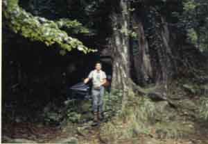 ![]() 小杉谷の朝。この木の洞にテントを張った。 Early in the morning in Kosugi-dani. In this hollow tree, we had pitched our tent. |