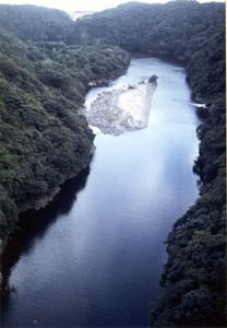 ![]() 既に河口部であるにかかわらず、水が澄み、両岸が自然林に覆われた安房川。林の切れたところが河口で、海が見えている。 Ambo-Gawa with clean water and forests on both sides even it is almost at the river mouth. The end of the forest over there is the mouth of the river, where the Pacific Ocean is seen. |