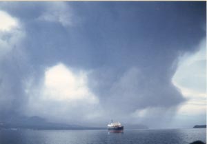 ![]() その後舞い降りる火山灰。 Volcanic ash from Sakurajima falling on the sea and land |