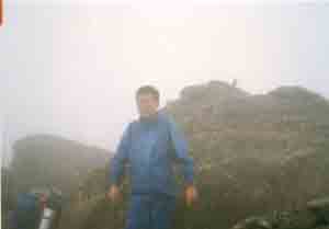 ![]() 霧雨と強風の宮之浦岳頂上 At the top of Miyanoura-dake in rain and wind |