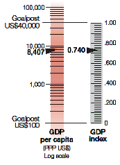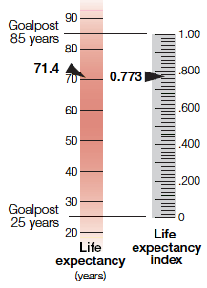 しかし、そのような力が特に重要な後発開発途上国では、統計自体があまりないため、そのような国の多くでも統計のある出生時平均余命(平均寿命)、識字率、就学率、1人当たりGDPだけを使い、最低値を0、目標値を1として、その間のどこにあるかを示しています。平均寿命については、最低値を25歳、目標値を85歳としています。識字率と就学率に関しては、0%が最低値、100%が目標値です。1人当たりGDPに関しては、最低値を100ドル、目標値を4万ドルとしています。