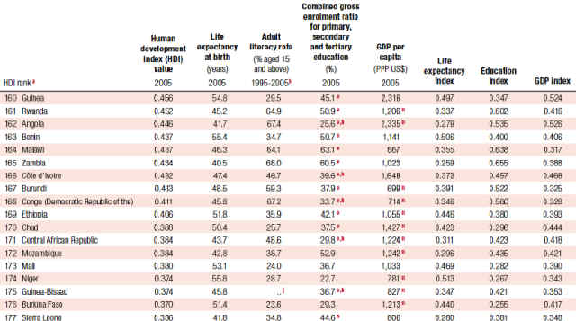 人間開発報告書2007/08による2005年時点での数値は、177か国について示されています(アフガニスタン、イラク、北朝鮮、ソマリア他については、計算できるだけの統計がありませんでした。)。