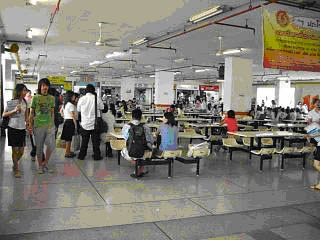 学生食堂。ショッピングセンターの大衆食堂と同じく、小さな店がたくさんあって、そこから好きなものを買って食べるようになっています。