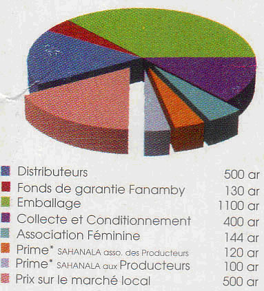 右側は、その箱に印刷されている売り上げ配分のグラフ(ar = アリアリ(マダガスカルの通貨。1,000アリアリが約70円))
