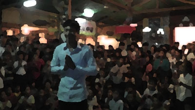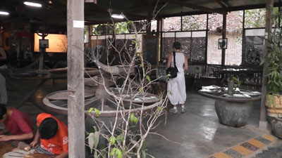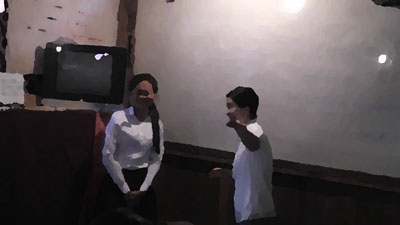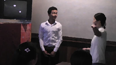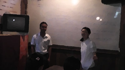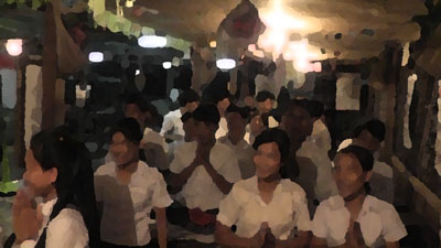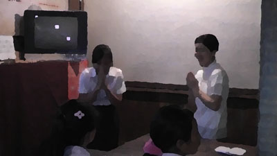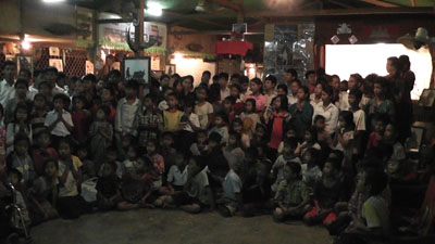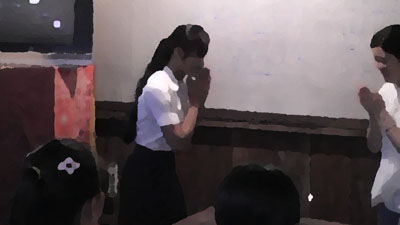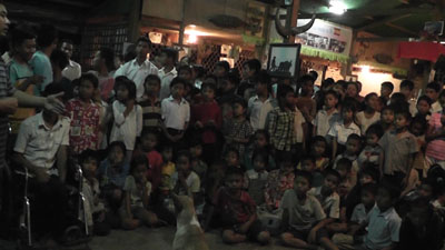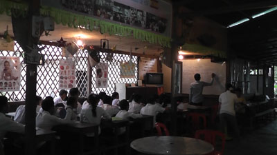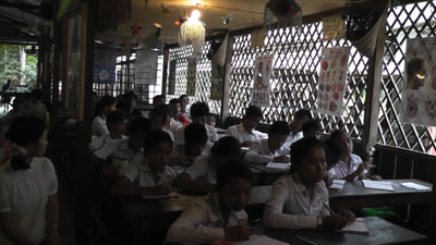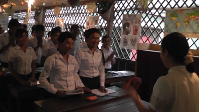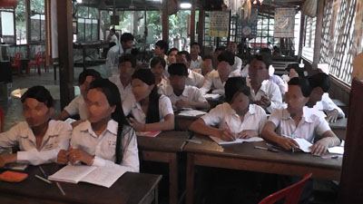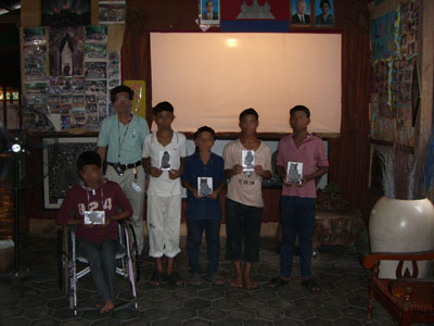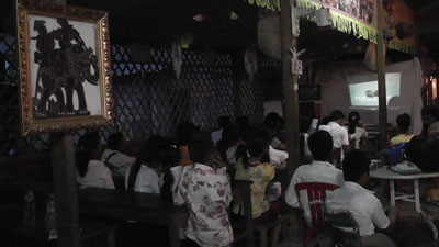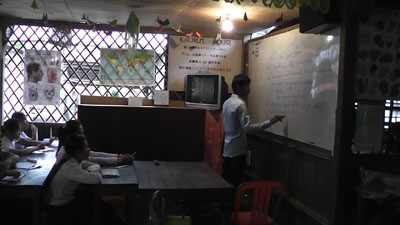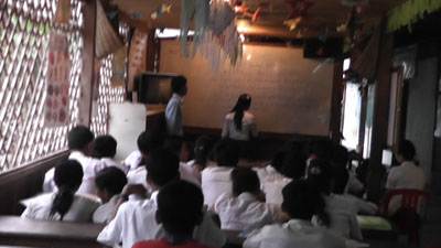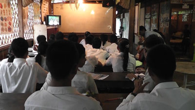 アンコール遺跡群観光の拠点になっているシエムリアップの町から東に30分ほどトゥクトゥク(4人乗りカートをバイクで引く乗り物)で行ったところにバコン村があります。ここには、世界遺産のアンコール遺跡群の一つのバコン遺跡がありますが、その斜め向かいに18歳位までの孤児70-80人が暮らすリトル・エンジェルズ孤児院があります。この孤児院では、子供たちが、カンボジア伝統の革細工による影絵を作り、観光客等へのその販売益を運営費と子供の収入としています。また、子供たちのための学校としての機能も持ち、その教室部分を借りて、夜に中学生たちのための英語教室が、大学生のボランティアにより行われています。今回のビデオレター交流は、この英語教室に通う中学生たちとの間の交換を目指したものでした。
