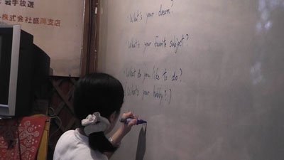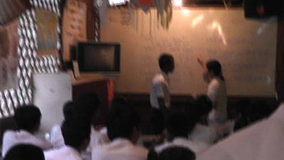 ![]() 私たちが着いた時、まだ授業が行われていました。 みんな普段は思い思いの服装なのですが、ビデオ撮影 があるというので、行事の時などの白いシャツに 白いズボン・スカートで来てくれていました。 12歳で中学に入るとは限らず、20歳前後 の人もいます。 |