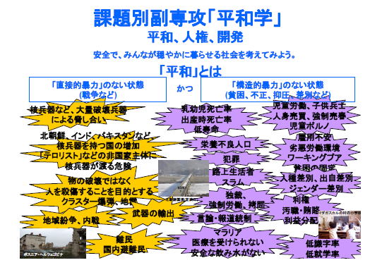 2013年4月の副専攻ガイダンスで配布した資料(pdf 約940KB) (副専攻「平和学」のポイントを6頁で紹介)