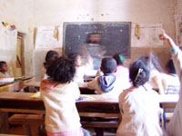 ![]() 校舎は父母がボランティアで 修理しているが、校長以外の 教員の配置されていない マダガスカルの村の 小学校(2005年) |