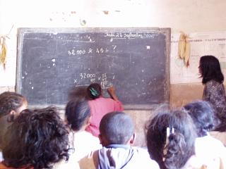 | 授業風景。みんな熱心。5年間で3回進級試験があり、落第して長く小学生をやっている子供も入るとのこと。 先生は、時々、ムチで机をバシッとたたく。 公立小学校と言っても、校長先生以外は公務員ではなく、村の人たちがお金を出し合って謝礼を払っているのが実情とのこと。 |