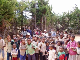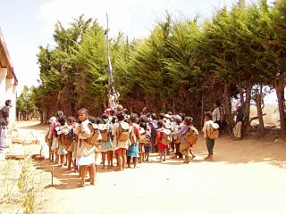 | 帰宅しようとするところ。 2人の子供がゴム草履をはいていた以外、みんな裸足だった。田舎では、大人でも裸足が普通。アンタナナリボでも、裸足の人がいる。 |