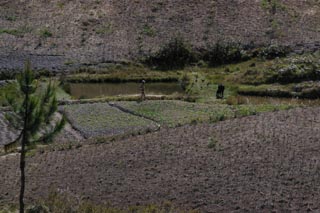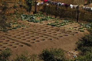 ![]() 大きくおいしそうに成長したキャベツが途中で見られた。 水分保持のために穴の中で野菜を栽培する方法が あちこちで見られる。 |