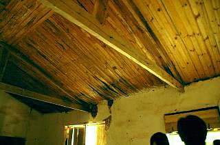 ![]() 雨漏りのために天井がかなり傷んでいる。 |