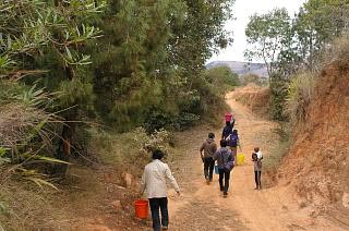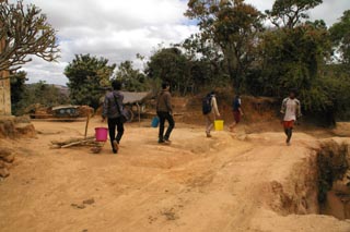 ![]() 村の女性は、頭に乗せた水から手を離し、 片手に荷物、もう片方の腕で子供を抱くなどしているのが 普通。隊員はまだ片手でバケツを支えながら歩く。 ( (c)Takeuchi) |