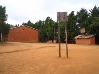 ![]() 小学校の校舎(左)とトイレ。トイレは傷んでいる。 また、生徒はほとんど使わないとのこと。 2年前にはなかったバスケットボールのゴールが 協力隊員の音頭取りで手作りされていた。 ( (c)Takahashi Toshiaki) |