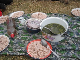 ![]() 村の方から頂いた昼食。たくさんのご飯(伝統の赤米)、 タロイモ、野菜のスープ。隊員によれば、野菜のスープに たくさんの豆が入っている点、いつもよりも豪華とのこと。 ( (c)Sakamaki) |