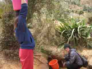![]() ちょうど隊員の住まいの水がなくなっていたので、 みんなで水汲み体験をさせてもらった。 水源から溝が掘られて、集落に比較的近いここまで水が 引かれている。水は少し濁っている。村の人達はそれを そのまま飲んでいるとのこと。隊員には、JICAから 浄水器が与えられている。 |