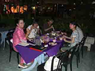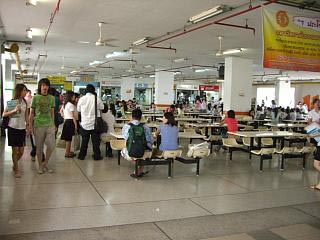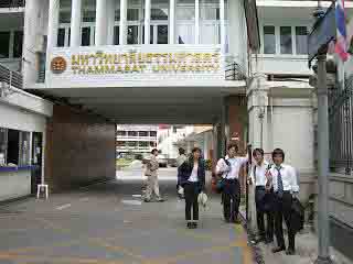 ![]() 昼食の後、チャオプラヤ川の定期船に乗る予定だったが、 海軍のお祭りの練習のために川が閉鎖され、定期船は 運休していた。そこで、近くのタマサート大学に行ってみた。 |