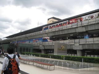 ![]() 数年前にできた高架式鉄道{スカイトレイン」。1997年の 経済危機もあって、道路の深刻な渋滞が一時緩和したが、 再び、渋滞は深刻になっていた。タマサート大学からの 帰りも、我々のホテルの方向の渋滞を嫌うタクシーの 運転手たちから次々と乗車拒否に遭い、ホテルには バスを乗り継いで戻る結果になった。 |